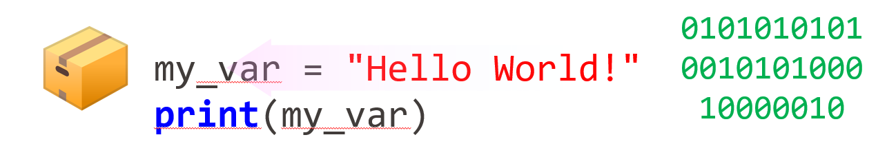 The first line shows the python synthax to create a simple variable containing the text information (the second line contains a *function” print()