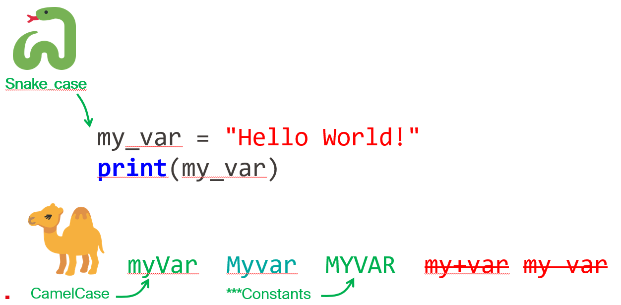 Variables in python must be written in a proper way. Some of the following naming will work but it is not considered very pitonish. Use only lower-snake-case for variables e.g. my_var, and capital-snake-case for constants e.g. CONST (variable that must not change value through out the script)